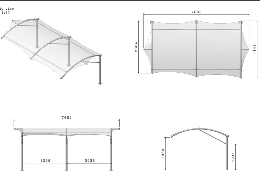 طراحی انحنادار سقف سازه چادری علاوه بر زیبایی ظاهری، باعث توزیع مناسب بار، هدایت آب باران و جلوگیری از تجمع آب روی سقف شده است.فرم سازه پارچهای به گونهای انتخاب شده که در کنار استحکام، جلوهای مدرن ایجاد کند و با فضای معماری اطراف هماهنگ باشد. طراحی مهندسی دقیق موجب توزیع یکنواخت بار و افزایش دوام سازه شده است.